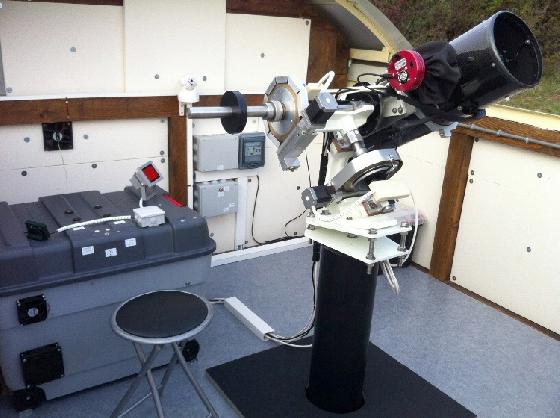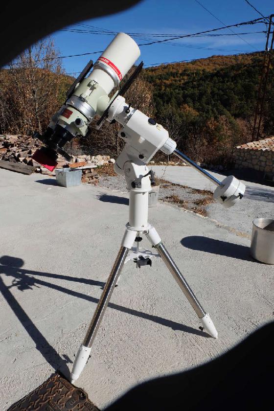 Monture équatoriale à fourche, pilotée par FS2. Masse de l'ensemble, environ 500kg. Des détails mécaniques seraient à revoir pour une utilisation en astrophotographie, CCD. Photos du ciel prises avec téléphone disponibles.