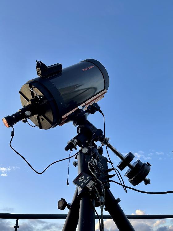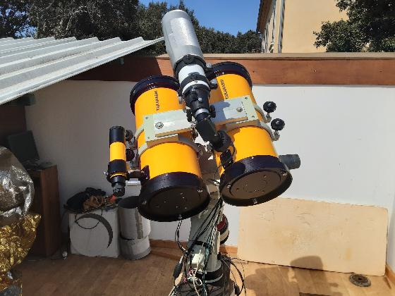 Le télescope est équipé de son chercheur Célestron 9x50 mm d’origine, d’un viseur point rouge, de sa queue d’aronde format Losmandy (fixation tube C8 sur la monture EQ8), d’une deuxième queue d’aronde Geoptik orange au format Vixen pour y fixer une lunette guide ou un autre équipement (APN par exemple), de sa lunette guide TS Optics 80/328 mm, d’un focuser Baader Diamond Steelback SCT, d’une queue d’aronde Plus à 2 boutons de PrimaLuceLab, de son filtre solaire Célestron Eclipsmart 8 pouces, de son pare buée Astrozap avec résistance chauffante avec sa commande de puissance Dewzap Pegasus et son alimentation 220 v dédiée, de son renvoi coudé Kepler diélectrique 99% coulant 50,8 mm, d’un viseur polaire pour monture EQ8, d’une caméra QHYCCD Polemaster pour l’alignement polaire du télescope et d’une caméra planétaire ou de guidage ZWO ASI 120MM Mini.