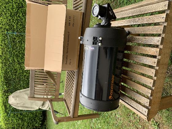 Essonnele 09-10-2021 par SergeGTube C8 XLT en très bon état acheté en octobre 2018 équipée de deux support vixen, d'un pare-buée Celestron, de deux résistances électriques et d'une motorisation électrique Pierro Astro à monter ou démonter selon l'usage
