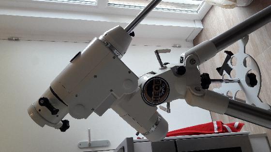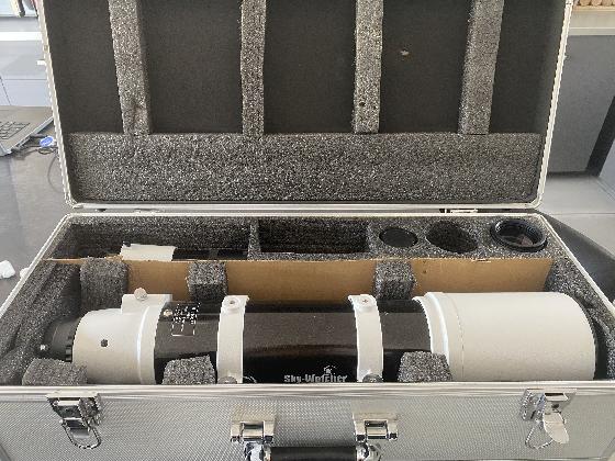 Excellent état cosmétique, exception faite de quelques traces de serrage habituelles sur la platine Vixen et un très léger choc sur le masque de Bahtinov. Bon état optique, quelques poussières internes sans incidence sur les clichés finaux.