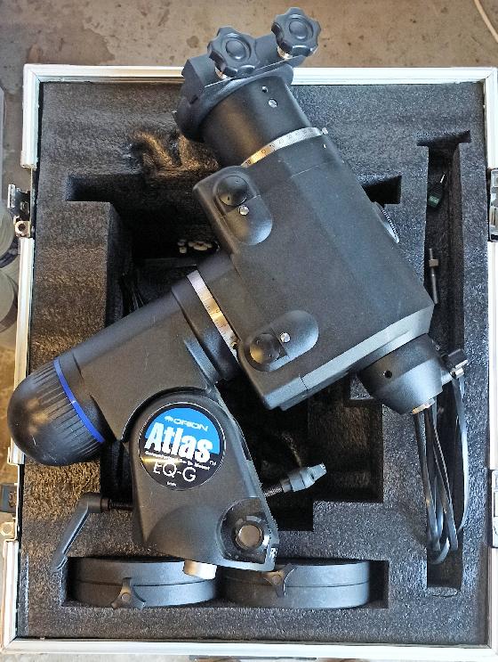 Haute-Garonnele 21-10-2024 par delta14Monture Atlas EQ-G SynScan GoTo standard avec raquette de commande SynScan V3, viseur polaire intégré, trépied tubulaire en acier chromé, platine porte accessoires et deux contre poids de 5kg chacun, vis de réglage de latitude remplacées par des vis Pierro Astro..
