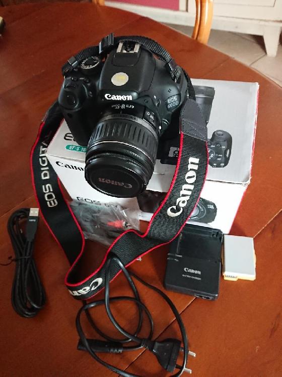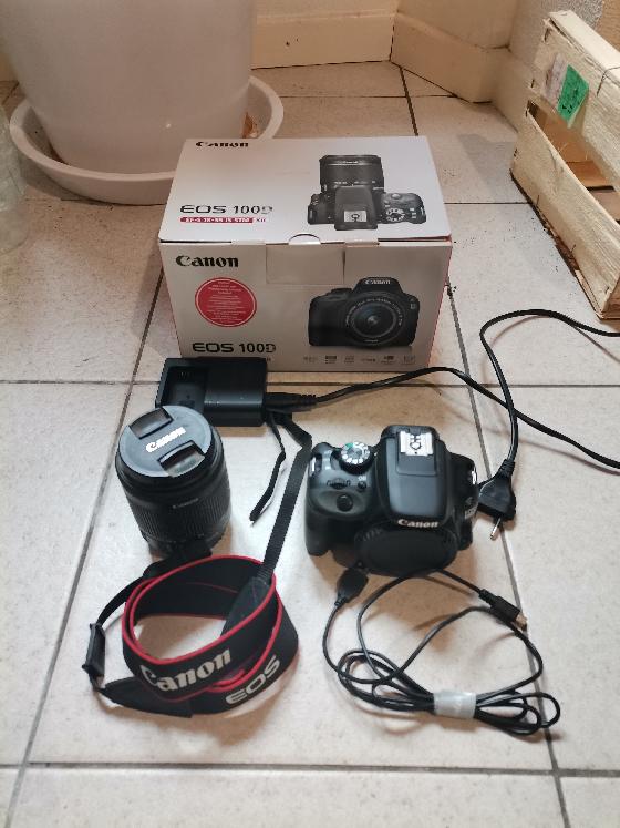 Fourni avec un zoom Canon EF-S 18-55mm f3.5-5.6, 1 batterie d'origine et 1 supplémentaire d'origine, chargeur de batterie et câbles ordi/vidéo.