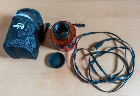 La caméra est vendue dans sa boite, avec un câble usb3 et deux bagues filetées d'adaptation. J'ajoute également un porte câble imprimé en 3D.