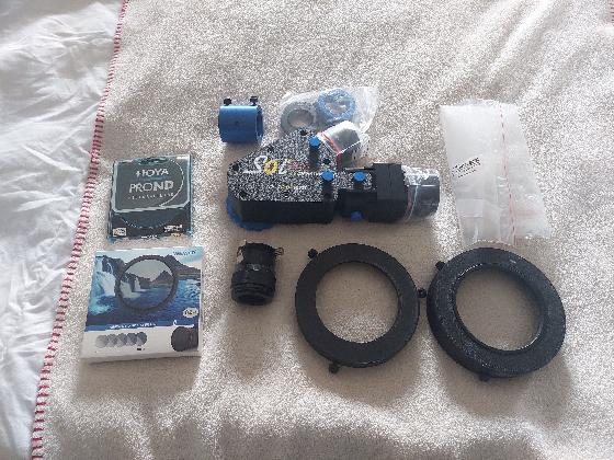 - un samyang 135mm f/2.0 en monture canon + pare buée et capuchons avant/arrière.