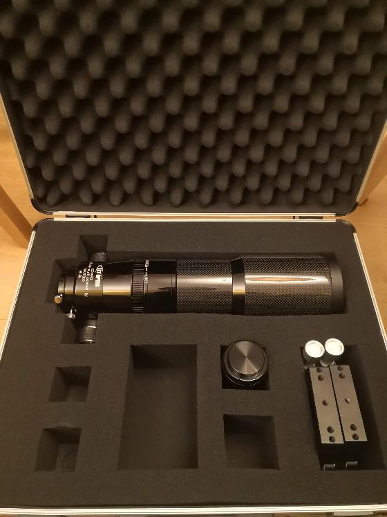 Sky Watcher vend cette lunette sous le nom plus connu d'Equinoxe 80ED, le tube carbone en moins. Je la vends avec le correcteur de champ SkyOptic, les anneaux et la valise de transport.