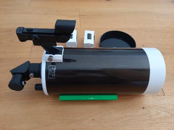 Le télescope est vendu avec son renvoi coudé d'origine, le chercheur point rouge et les deux oculaires d'origine 10 et 25mm. Il est en excellent état, très proche du neuf. Il y a uniquement quelques marques sur la queue d’aronde, datant de l'époque où je le montais sur une AZ-GTI.