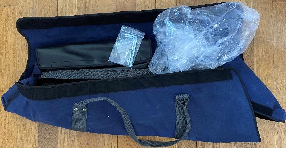 Elle est livrée avec un viseur polaire lumineux, moteur pas à pas et la raquette de commande DD-3 piloté par quartz, contrepoids, trépied et sac de transport en nylon (cf photo du sac de transport avec les outils dans le petit sachet ainsi que le sachet plastique dans lequel j'enveloppe la monture pour la mettre dans la sac de transport).