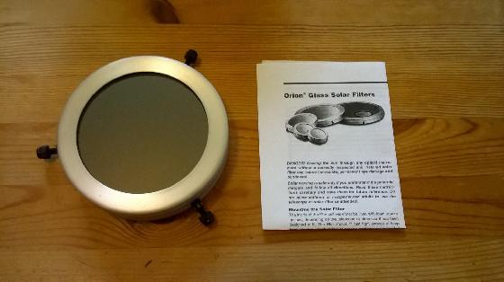 Je mets en vente ce filtre de marque orion, qui doit convenir pour des instruments d'ouverture 100mm. Le filtre fait lui-même 95mm, et le diamètre du tube sur le quel on peut le monter est au maximum de 115 mm (j'ai mesuré le diamètre de la mousse sur le bord intérieur du filtre).