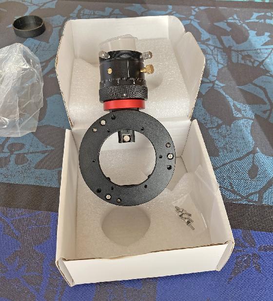 Livrée avec une bague supplémentaire neuve ZWO M54 Sensor Tilt Plate ( vendu neuf 45€ hors frais de port ) pour installer des accessoires en M54 au lieu de M42 (M68 OAG ou 2”EFW par exemple) .