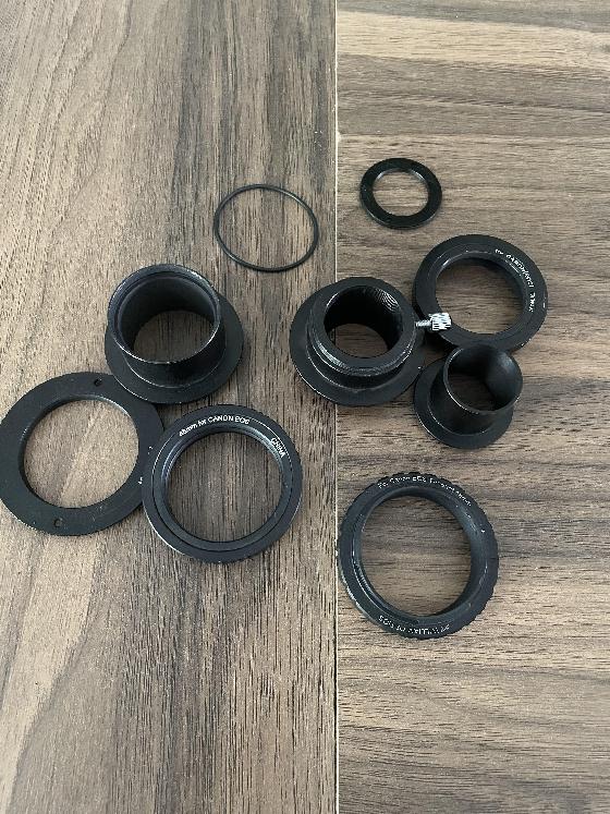 Il y a des adaptateurs T2, bague T2... Tout est sur la photo. Je n'ai pas fait de recherches pour avoir chaque références. Je les brade.