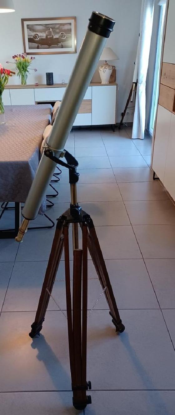 Je l'avais trouvée en France, dans une condition qui laissait à désirer, puis après un fort nettoyage, il s'avérait que ça n'était pas suffisant, il a fallu faire une petite restauration légère : avec un pote du club, nous y avons mis les moyens pour nettoyer les laitons/cuivres, bois, et quelques fines retouches de peinture sur la monture et du vernie sur le pied. L'ajout d'une chaîne pour le trépied a apporté de la stabilité, et surtout, ayant une Secrétan 61mm de la même époque, on a pu voir qu'elle manquait, en comparaison. Puis il a fallu s'attaquer aux optiques, qui sont maintenant propres, alignées, calées, colmatées... la lunette est parfaitement fonctionnelle maintenant. Pas de chercheur et uniquement l'oculaire fourni, pas de contrepoids, je pense que ces lunettes étaient livrées en l'état jadis, sans plus de réglages possibles. Elle dormait dans un grenier ou une cave, elle a maintenant fière allure, elle garde ses rides de l'âge, mais est de nouveau opérationnelles, pour les amateurs de belles pièces anciennes.