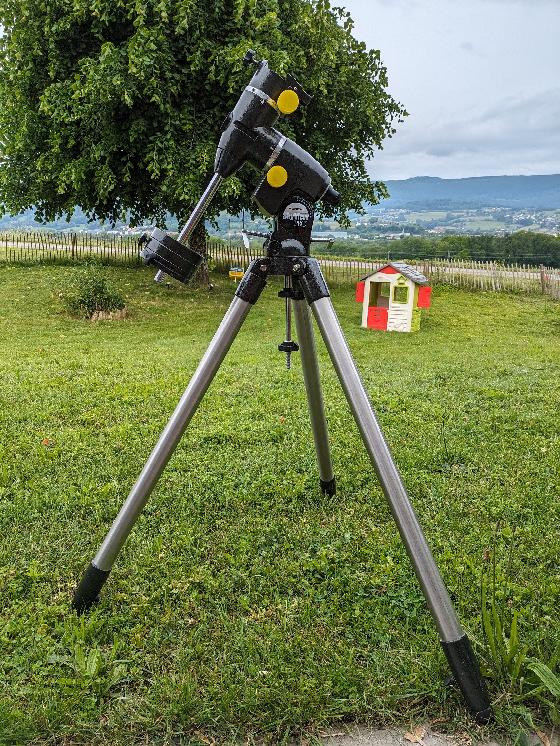 Une pieces à 45 degrés peut etre ajouté sous l embrase pour la mettre en équatoriale....un petit moteur assure le suivi pour du visuel . Idéal pour un mak ou lunette courte.
