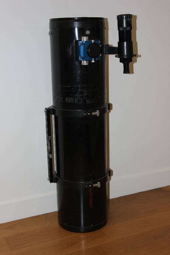 Le télescope est vendu avec son renvoi coudé d'origine et un chercheur point rouge. Il est en excellent état, très proche du neuf. Il y a uniquement quelques marques sur la queue d’aronde, datant de l'époque où je le montais sur une AZ-GTI.