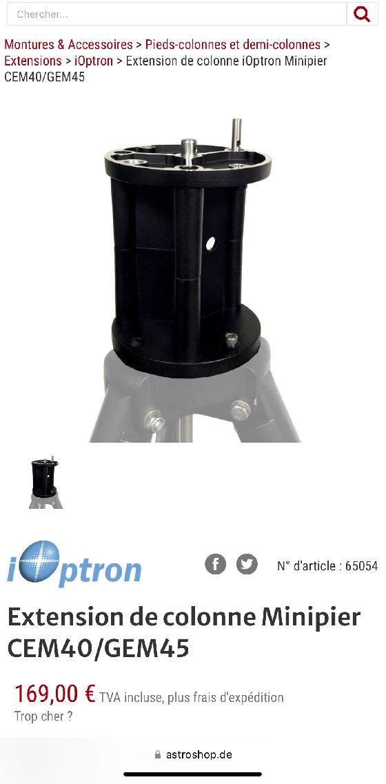 je vends Extension de colonne iOptron pour gem40/45. Tout neuf jamais servi prix d’achat neuf c’est 169€, pour plus d’informations n’hésitez pas à me contacter le prix est 100€