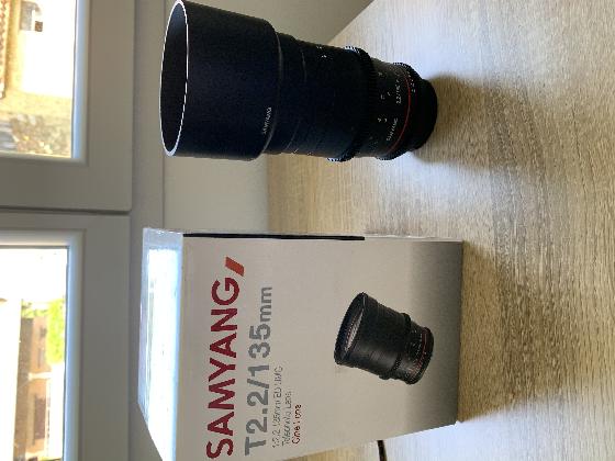Je vends l'excellent Samyang 135mm T2.2 (équivalent F2). Donc petite particularité sympa, il s'agit de la version optimisée pour la vidéo, ce qui permet d'avoir plus de précision dans le choix de l'ouverture, ce n'est plus des "crans" obligatoires comme sur la version photo. Le réglage est lisse.
