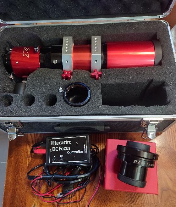 Elle est fournit avec le correcteur/réducteur william optics 0,8x adapté à la lunette, complet, dans sa boite avec ses bouchons