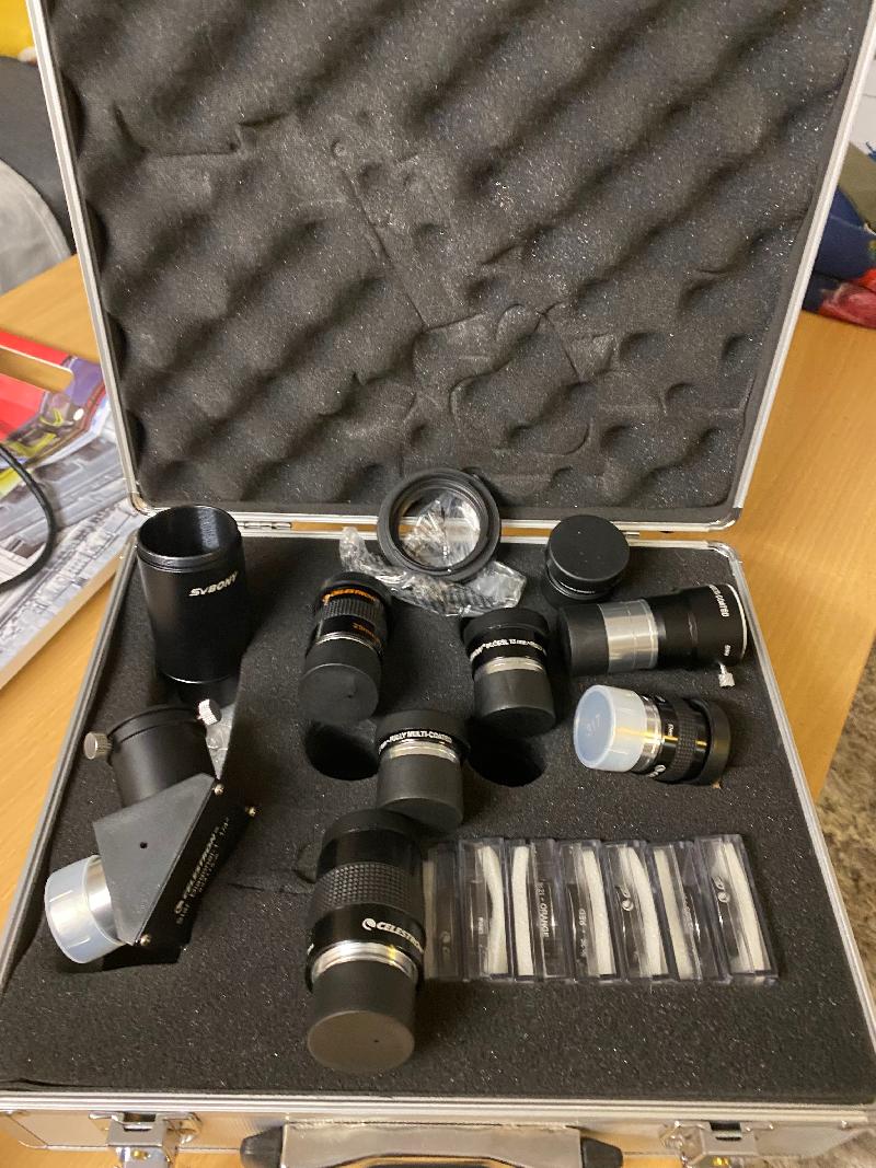 (Oculaires (Plössl (4 lentilles, champ 52 ° ), 6 mm, 8 mm, 13 mm, 17 mm et 32 mm , Barlow 2 X , Filtres 1,25'': jaune, orange, rouge, vert, bleu foncé, bleu clair et filtre lunaire )