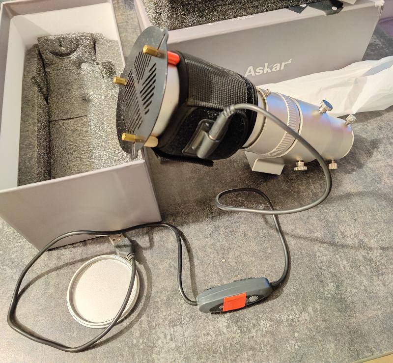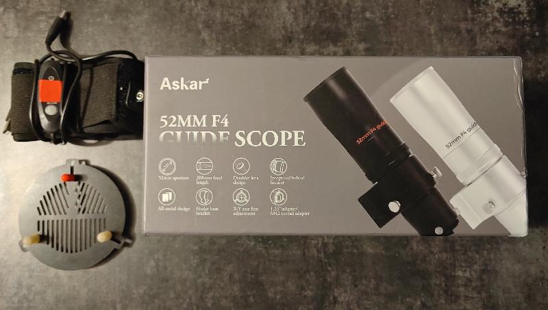 Askar guidescope 52 mm F4, 208 mm de focale avec également une bande chauffante USB 5v et un masque de bahtinov.