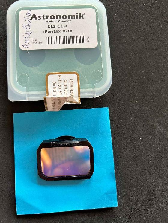 Filtre clip pour Pentax K1Prix: 180€Tarnle 19-12-2025 par Jean louis DryeFiltre Astronomik anti pollution lumineuse CLS CCD clip pour Pentax K1