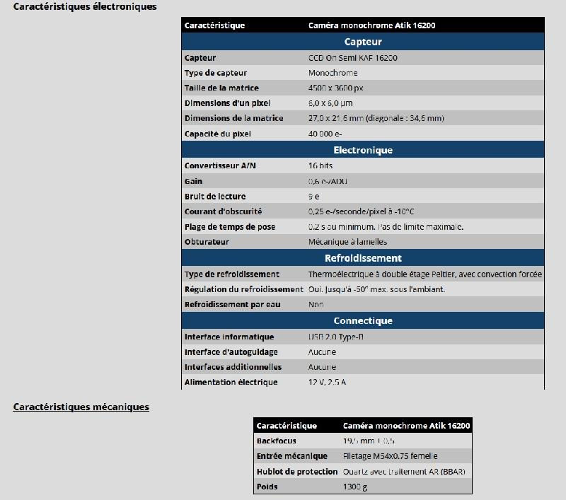 - la caméra elle-même (Atik 16200 mono - grade 2) ;