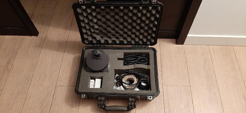 Idéal pour astrophotographe débutant: camera CCD SBIG STT2000XCM couleur, inclut un second capteur permettant l'autoguidage à travers l'instrument servant à l'acquisition. Elle remplace donc une caméra d'acquisition, un diviseur optique ou lunette guide, et une seconde caméra d'autoguidage pour un suivi parfait même à longue focale. Simplifiez vous l'astrophotographie: Pas de roue à filtres à gérer, une seule caméra à alimenter et interfacer à votre PC par un câble USB, pas de problèmes de flexion différentielle ou réglages complexes, vous êtes immédiatement prêt à acquérir de belles images du ciel profond. Excellent état , fournie complète avec tous ses accessoires (alimentation, câbles, bagues), les manuels d'origine SBIG, le tout dans sa valise Pelican d'origine estampillée SBIG.