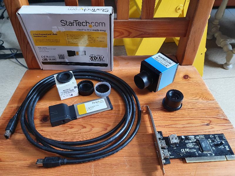 Accessoires cédés avec la caméra: Adaptateur Baader c-mount vers 31.75 et son bouchon, Barlow VIXEN télé-extender 2.4 X (C-mount vers 1.25); cordon Firewire, carte Firewire au format expresscard pour PC portable, carte Firewire au format PCI pour PC fixe
