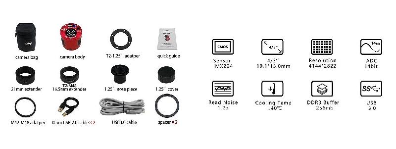 Pour avoir les spécifications techniques, aller par exemple sur le site https://www.pierro-astro.com/materiel-astronomique/cameras-astro/cameras-ciel-profond/camera-zwo-asi294mc-pro-refroidie_detail