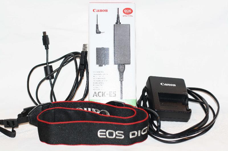 L'appareil est vendu avec un adaptateur secteur Canon ACK-E5 original neuf dans l'emballage, sangle, chargeur, batterie Canon et câble USB.