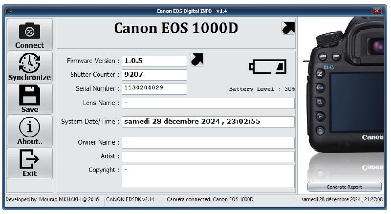 Suite au passage à la caméra CCD, je vends un Canon EOS 1000d refiltré Astrodon par Richard Galli, en excellent état avec 9207 déclenchements. Il a juste quelques petites marques d'usure sur le grip. Il est fourni avec un zoom EF 70-210 F/3.5-4.5 en bon état (pas de rayures, juste quelques poussières internes inévitables), une carte 4 GB, une batterie et son chargeur.