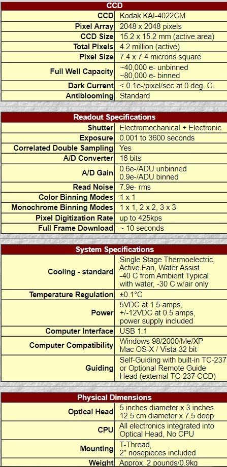 Cède caméra CCD couleur 4,2 Mega pixels autoguidée avec refroidissement thermo-electrique SBIG ST4000-XMC en parfait état avec 1 capteur spécifique TC237H (680 x 500 pisels de 7,4µm x 7,4µm) pour l'autoguidage et 1 capteur couleur KAI-4020CM pour l'imagerie : 2048 x 2048 pixels de 7,4µm x 7,4µm .