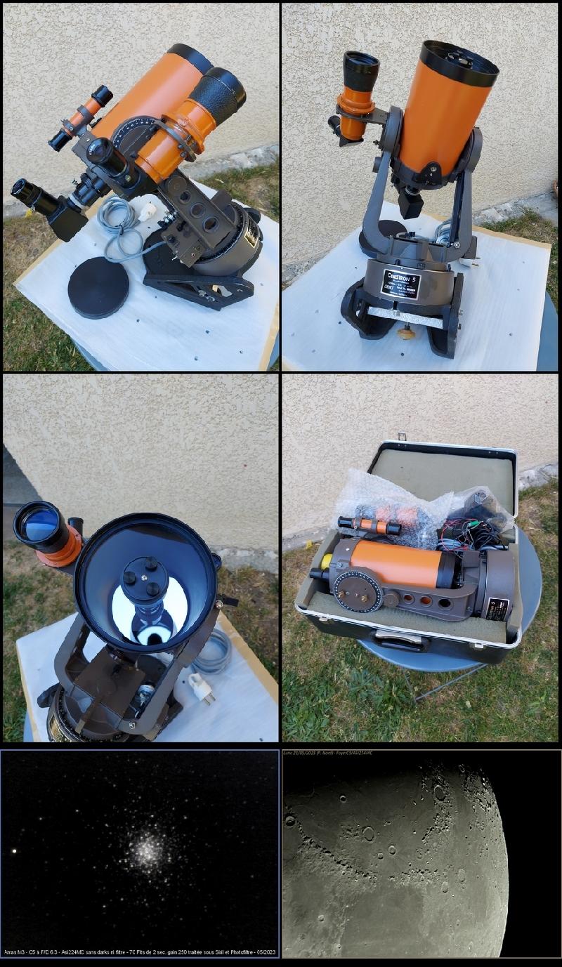 Je me sépare de mon Celestron 5 acheté en octobre 1982. Je le vends principalement pour son tube optique encore en très bon état et qui peut être adapté sur une monture go-to comme l'AZGTi en ajoutant une petite platine sur le support parallèle existant. Je m'en servais également sur un trépied photo comme télé/longue-vue.
