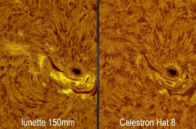 (possibilité de rajouter à la vente un filtre DAYSTAR ION 0,6 A où vous pouvez voir une image faite avec ce tube en comparaison avec une lunette solaire de 150mm sur un même groupe de tache)