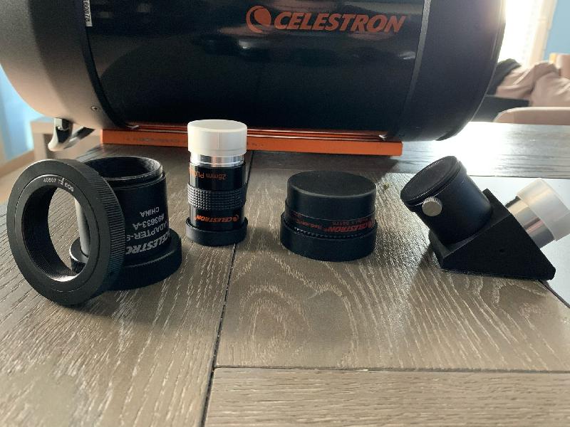 Vendu avec ses accessoires d'origine : oculaire Celestron Plössl de 25mm, renvoi coudé et chercheur d'origine. Vendu également avec le réducteur de focale Celestron x0.63, le tube extension pour fixer une bague T2 et un adapteur T2 pour appareils Canon EOS.