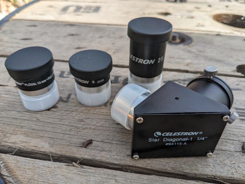 3 oculaires Celestron 25mm, 13mm et 9 mm, un chercheur Starpointeur, ainsi qu’un renvoi coudé.