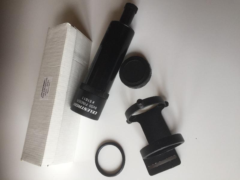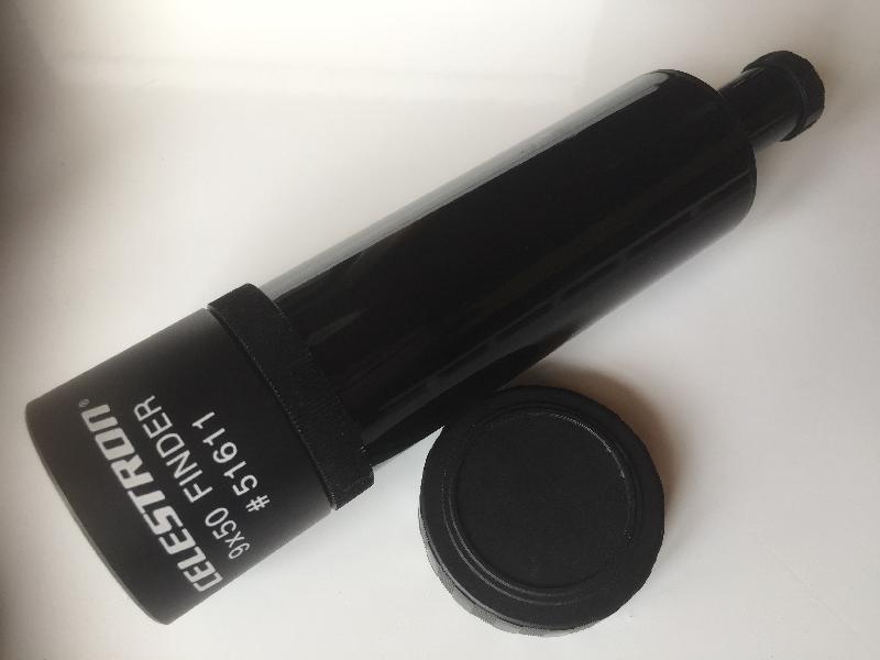 Chercheur 9 x 50 Celestron réticulé, excellent état, avec support à base courbée et anneau de caoutchouc our insertion dans le support.
