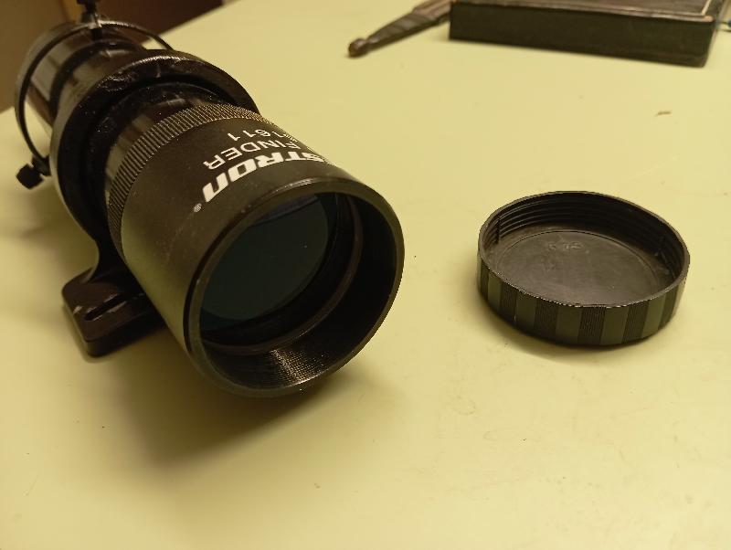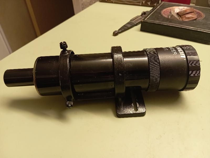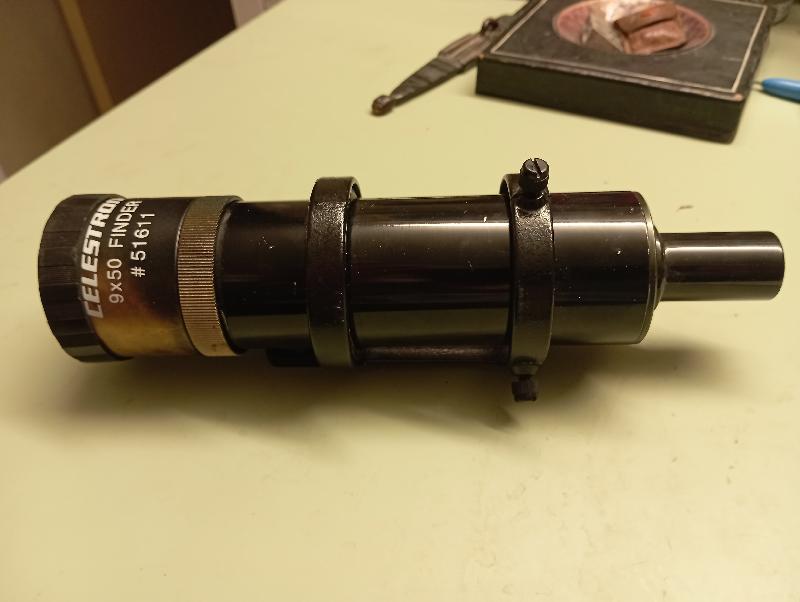 Chercheur Célestron 9x50 avec son support pour fixation sur télescope (ou lunette). Il manque le bouchon de l'occulaire mais ce n'est pas bien grave. Il y a une légère décoloration à l'avant (voir photo) sans aucune influence sur le chercheur. L'optique est parfaite et très claire avec un réticule en croix. le prix de 50€ comprend les frais d'envoi.