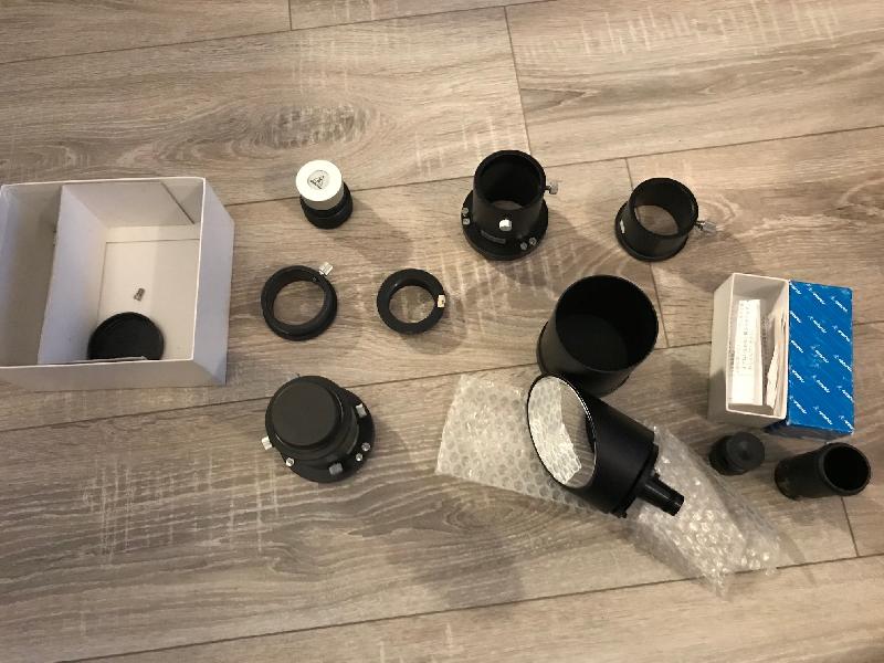 En accessoire j'ai le kit de conversion newton/cassegrin, le correcteur de coma pour la version newton, le système de réticule taka pour la collimation, le boitier électronique du motofocus, la platine en aluminium qu'on voit sur la photo pour mettre une lunette guide en // et l'anneau pour fixer le tube sur une monture Taka.