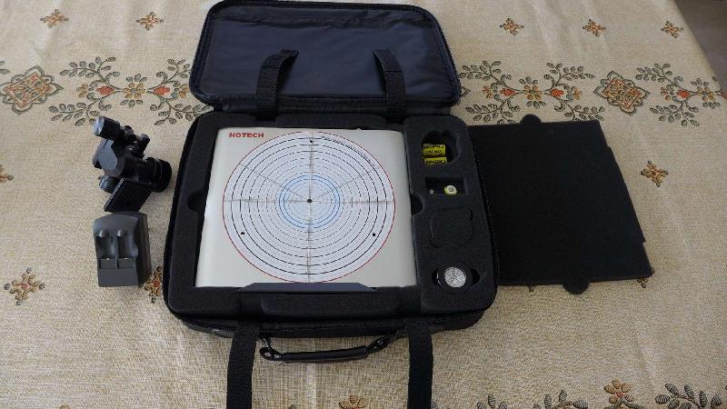 Grâce à l'intelligente version avancée du collimateur Laser, vous ajustez votre télescope Schmidt Cassegrain en un rien de temps et avec une haute précision. Il n'est pas nécessaire d'avoir un ciel clair car vous n'avez pas besoin d'étoile. Cette haute technologie d'unité d'ajustage se constitue d'une cible, dans laquelle, trois différents lasers s'engagent. La cible est placée, avant l'ajustage, devant l'ouverture de votre télescope. Les rayons laser atteignent le miroir principal, sont réfléchis et atteignent de nouveau la cible.