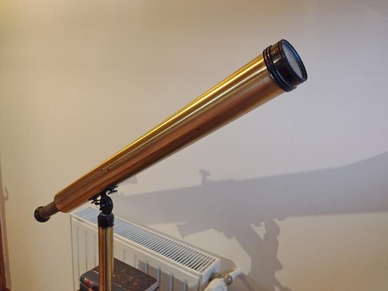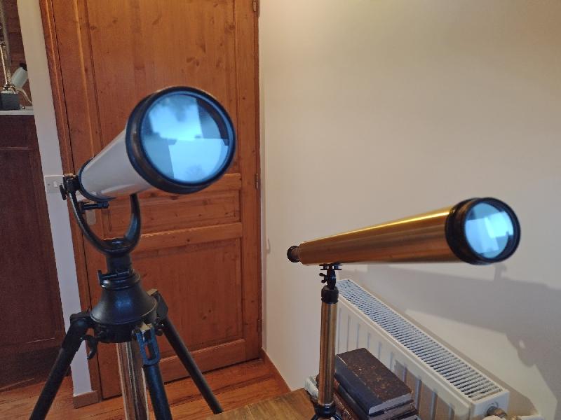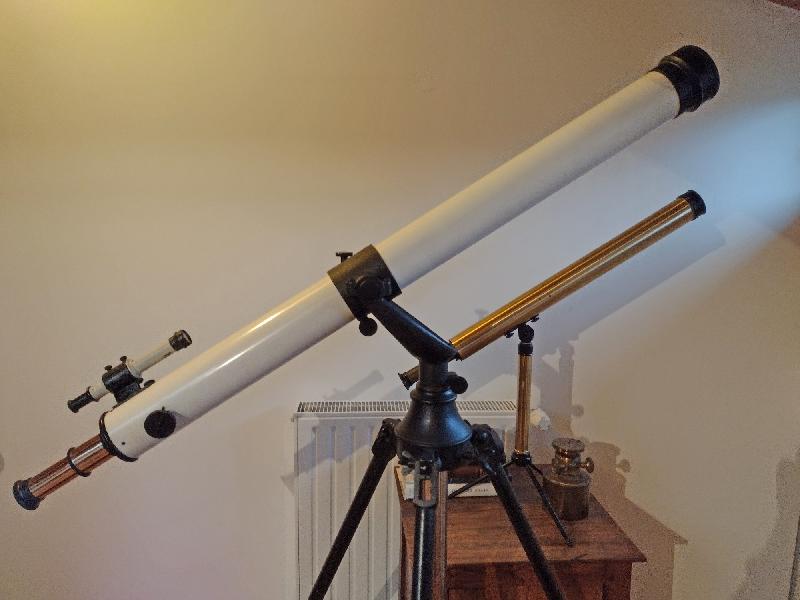 Une petite soeur de 50mm f/15 sur trépied de table, tout laiton, excellent état cosmétique et optique. Très belles images sur le ciel. 250 euros.
