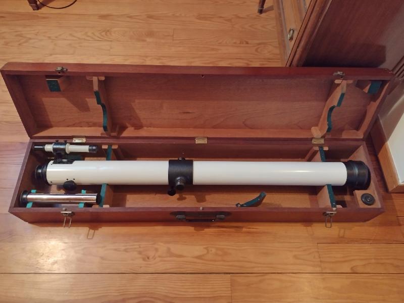 Une grande soeur de 75mm f/15 sur trépied haut, hauteur réglable par colonne centrale, excellent état cosmétique et optique, excellentes images sur le ciel. Peinture un peu écaillée sur le corps du chercheur. Grande stabilité et maniabilité. 3 oculaires Vion d'origine. Colonne, porte oculaire et oculaires chromés (parfait état). Belle caisse de rangement d'origine en acajou. 650 euros.