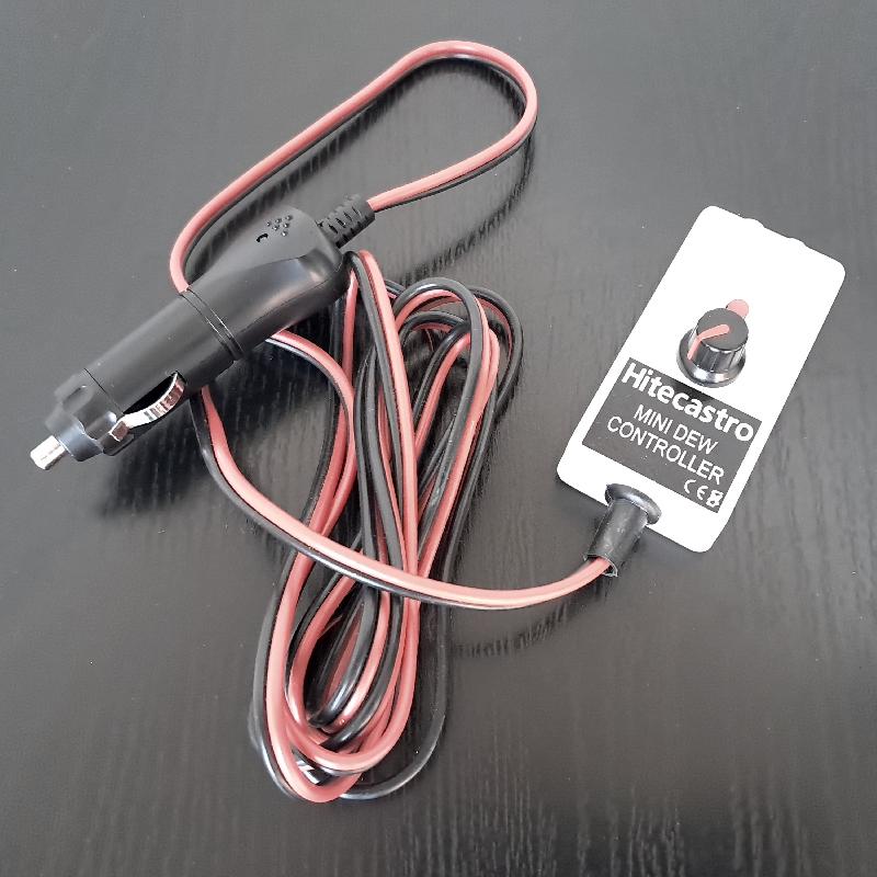 Contrôleur HITECASTRO pour 2 bandes chauffantes 12V (entrée : prise allume-cigare sur câble de 2 mètres, sortie : 2 prises RCA), le potentiomètre contrôle les 2 sorties en même temps. 3A max en sortie au total.