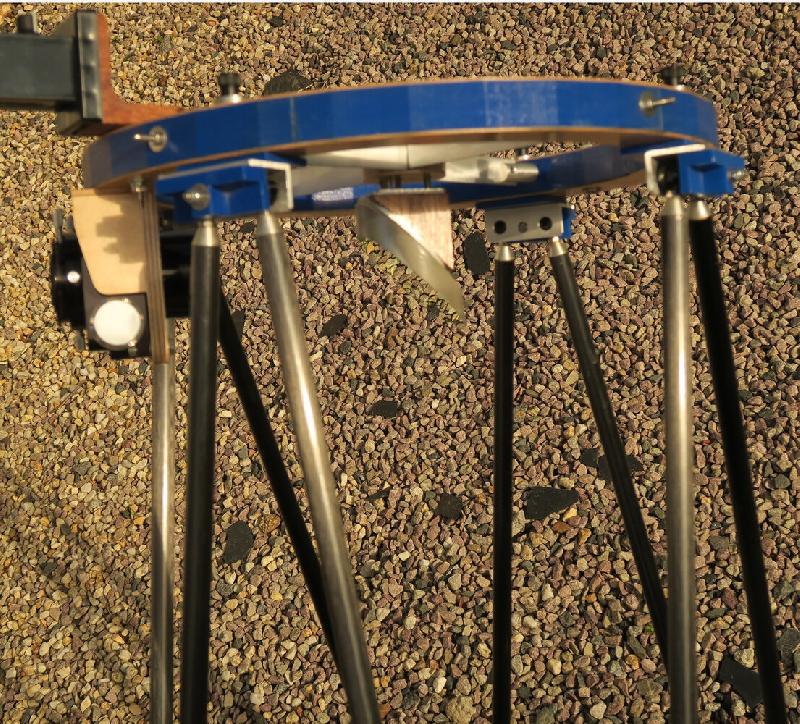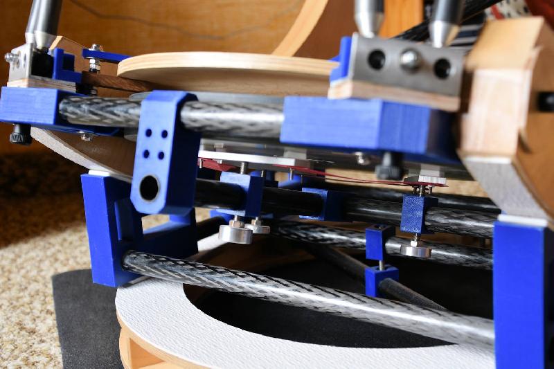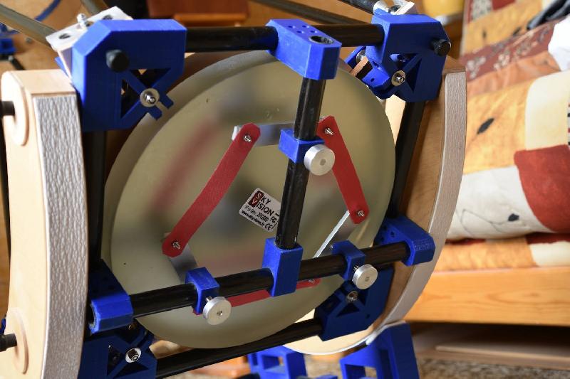 Le cadre du barillet est en tubes carbone, reliés par des pièces bleues imprimées en 3D.