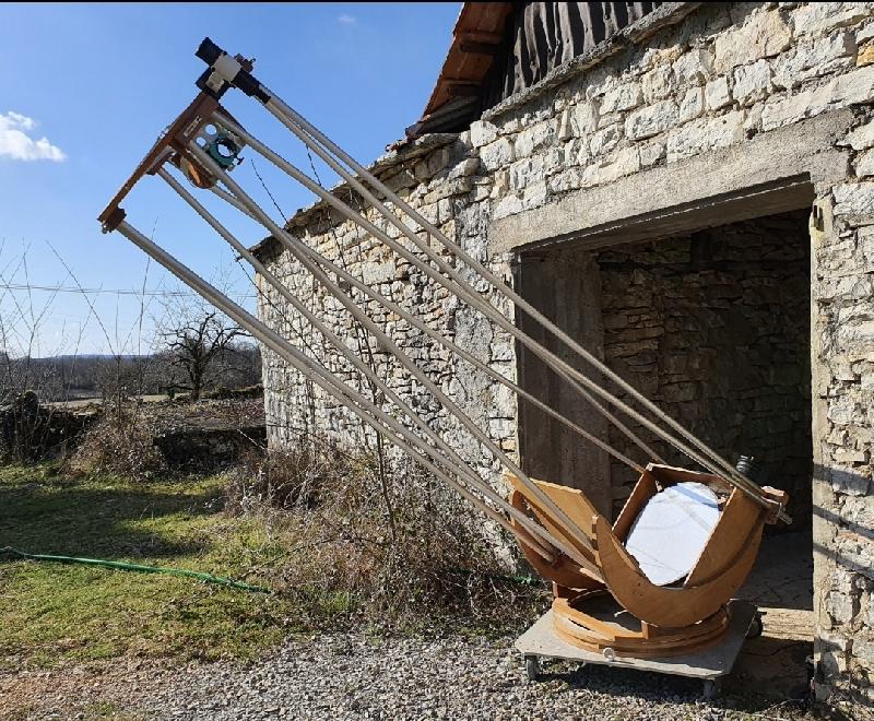 Suite au décès de mon conjoint, je vends ses deux télescopes qu'il utilisait pour nos animations. Je ne sais pas grand chose sur celui-ci , mise à part qu'il a été fait sur mesure et que le miroir vient de l'observatoire d'astronomie de Paris.