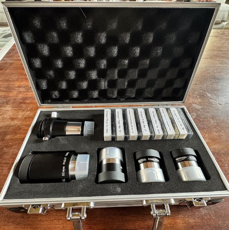 Vendu avec valise occulaires Omégon - 4 occulaires (32-12,5-6 et 4mm) - une lentille de Barlow 2x - 5 filtres couleurs - 1 filtre polarisant et 1 filtre lunaire Crystal View