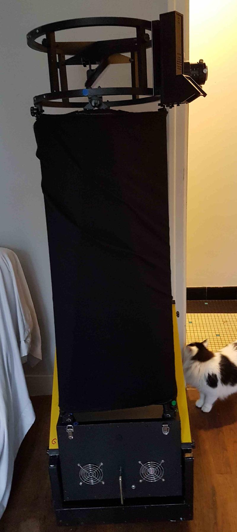 Les roues de l'unité secondaire et de l'altitude s'insèrent dans la boîte à bascule et la boîte à miroir comprend un couvercle pour le transport de sorte que tout le télescope se décompose en seulement deux boîtiers en aluminium pouvant être fermés,