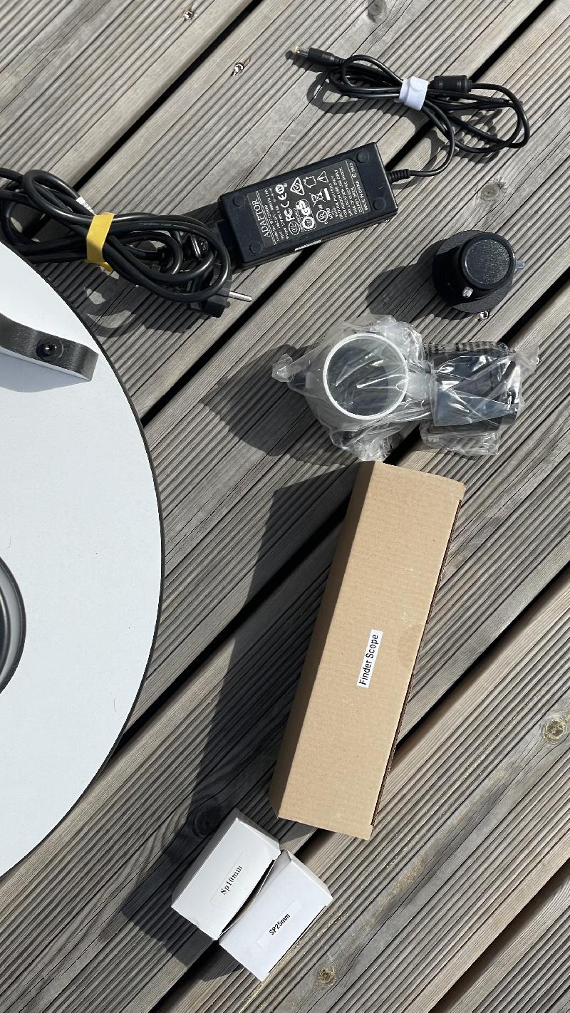 Vendu complet avec 2 oculaires Super 10mm et Super 25mm, alimentation allume cigare (le transformateur électrique n'est plus disponible tout comme le masque de bathinov), le chercheur et un laser de pointage (visible sur les photos).
