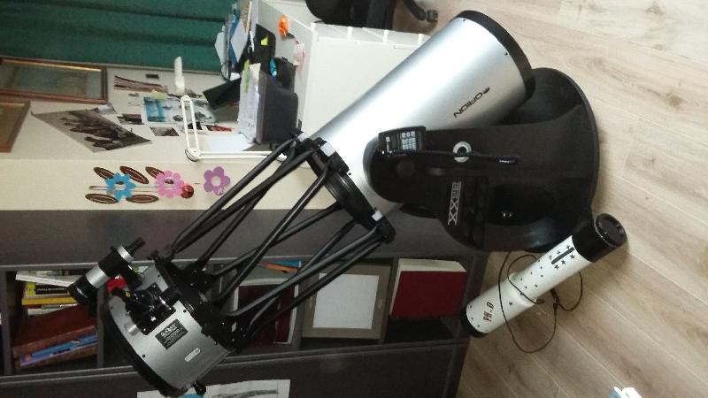 Vend suite changement de situation et il faut le dire un ciel de mon jardin de plus en plus obscurci par les arbres (écologiste et astronome à la fois !?) un ensemble avec DOBSON ORION à l'état neuf (neuf en mars 2016) - servi une petite dizaine de fois sur place et parfaitement entreposé. Télescope diam. 305 mm, focale 1500 mm. Très bel instrument fourni avec raquette IntelliScope d'aide au pointage. Et ses accessoires Laser de collimation, Oculaires Baader Hyperion 17 et 8 mm / 68° avec leurs bagues extension, filtre polarisant 31,75 mm. et le chercheur Telrad bien sûr. Vendu avec ses sacs de transports de qualité professionnelle.