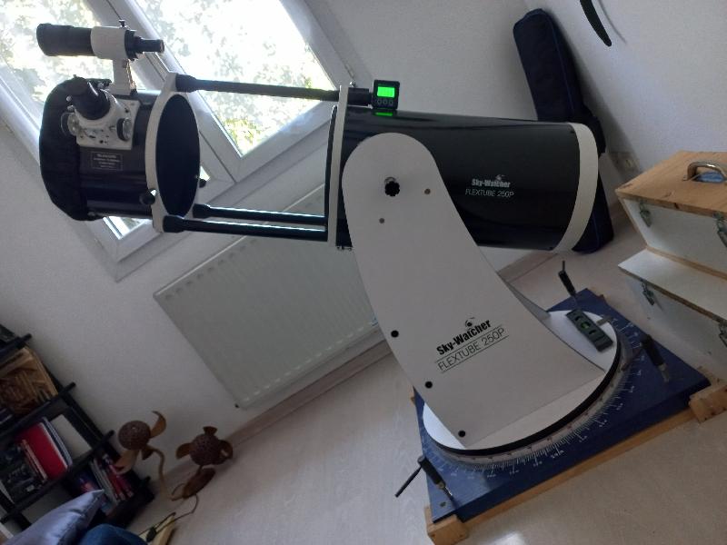 je met en vente mon télescope Dobson 254/1200 Sky-Watcher FlexTube, avec ses deux oculaires d'origines, ainsi que quelque amélioration que j'ai effectué pour plus de confort d'observation. Notamment un support gradué et un rapporteur d'angle numérique permettant la mise à niveau de l'instrument et de pouvoir pointer aisément aux coordonnées azimutale.