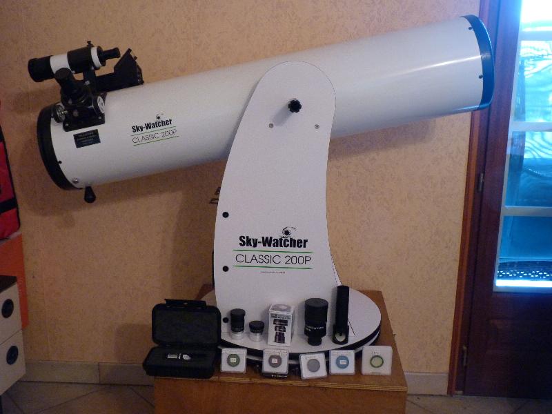 telescope Dobson 200/1200 , oculaires super plossl 20mm et 10mm , chercheur telrad , oculaire zomm hyperion mark IV 8-24mm , laser de collimation antares , lentille de barlow hyperion 2.25x , 7 filtres couleurs astro planetaires , filtre UHC omegon 1.25 , filtre OIII omegon 1.25 , oculaire de collimation cheshire , pour un prix a l'achat de 1170€.