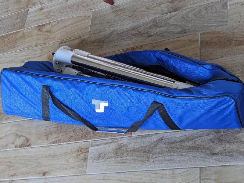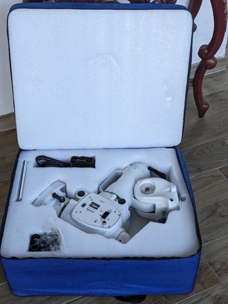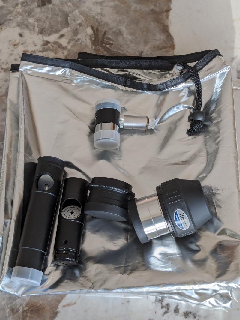 la raquette de commande Syncsan pour l’EQ6, une alimentation secteur pour l’EQ6, 2 contrepoids de 5kg chacun, un adaptateur/réducteur de 2 pouces vers 1,25 pouces, un laser et un cheshire pour la collimation du Newton, un oculaire grand champ de 28mm, un oculaire réticulé lumineux, un correcteur de Coma, un masque de bathinov, une bâche de protection, un chercheur droit 9x50.